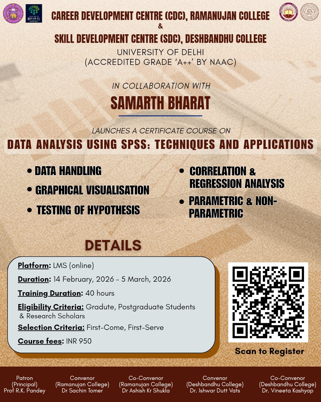 Ramanujan College, University of Delhi, was awarded Teaching Learning Centre (TLC). The TLC was set up with the motto of “Reaching the Unreached”. The Centre offers Faculty Induction/Orientation Programmes (FIPs) for newly recruited faculty and discipline specific and interdisciplinary Faculty Development Programs (FDPs)/Refresher Courses, Conferences and Workshops. The FIP content is based on the 12 Modules/Topics broadly including innovative teaching-learning pedagogies, research methodologies, ICT-enabled curriculum and e-content development, interpersonal skills and institutional values.